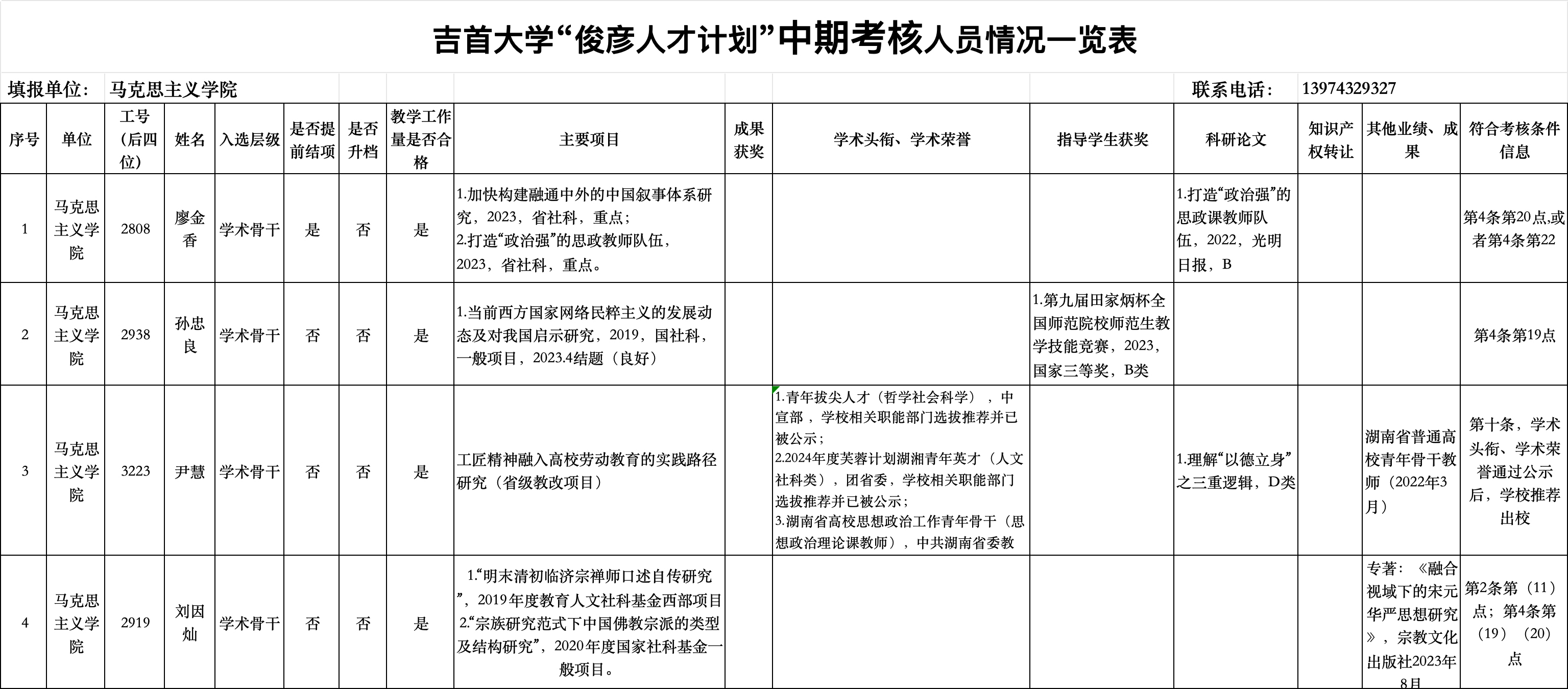 公示:根据《吉首大学关于做好2022年度入选“俊彦人才计划”人员中期考核工作的通知》要求,现将我院2022年度俊彦入选人员中期考核情况进行公示,公示时间:2024年3月28日--4月3日。如有异议,请实名按照公示内容向考核小组反映情况。联系电话:0743-8562002。