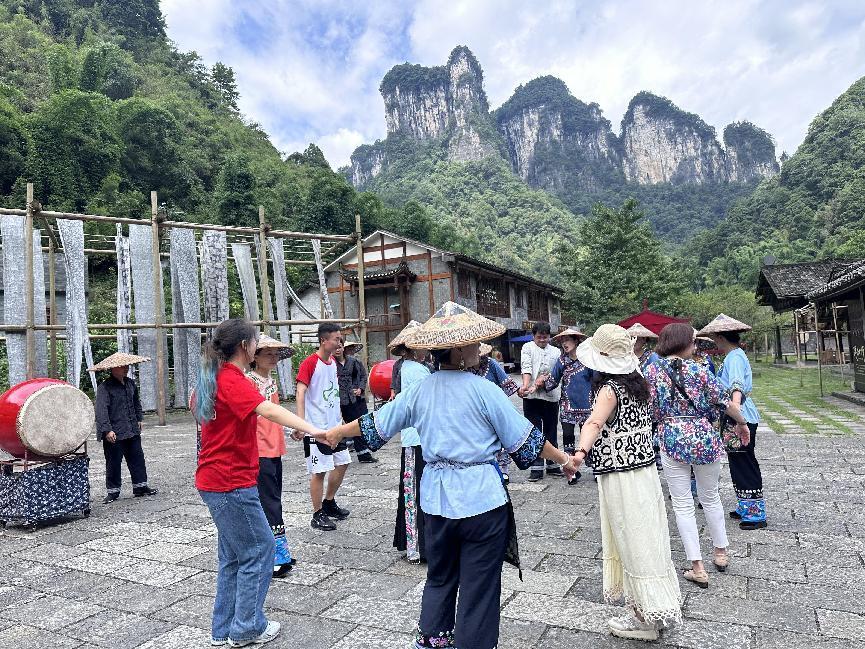 在德夯苗寨的簸箕舞表演中,调研三组被当地热情的村民邀请共舞。在与当地村民共歌共舞后,团队成员抛却了所有的不适,真正地融入了当地,体现了“三下乡”活动的内涵和要义。