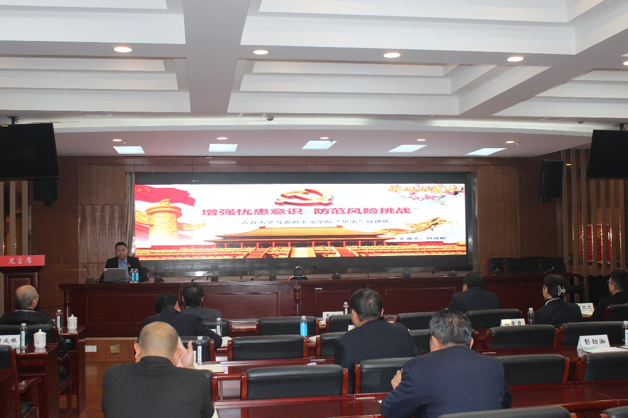 何成根以“增强忧患意识,防范风险挑战”为主题,表示全体党员同志要深刻认识到我国正处在收获与风险、机遇与挑战并存的历史发展期,明确增强忧患和风险意识是党自我建设中坚守的鲜明品格,党员同志们要不断增强自身的忧患和风险意识,提升防范化解风险挑战的能力,才能在机遇与挑战并存的时下,给人民和国家提交一份圆满的答卷。