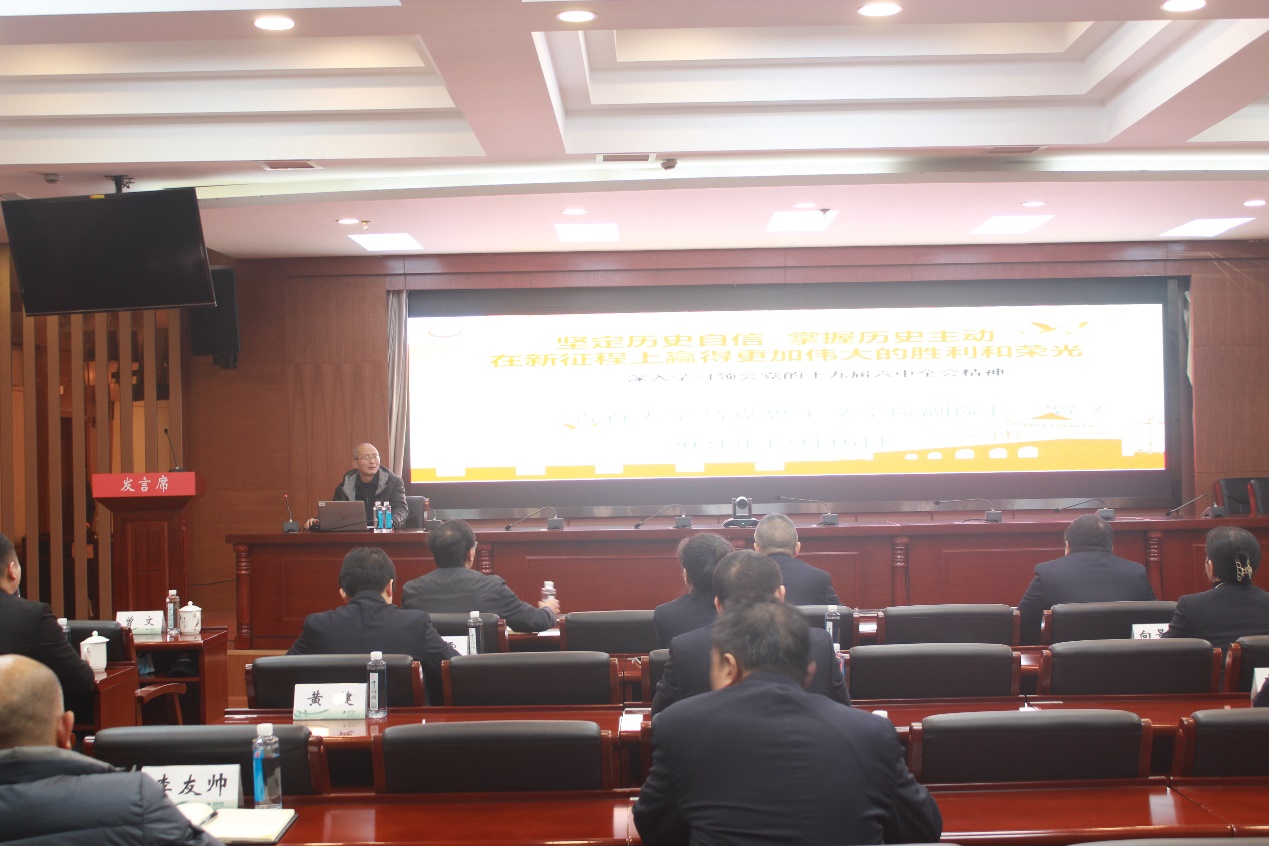 曾文副院长以“坚定历史自信、掌握历史主动,在新征程上赢得更加伟大的胜利和荣光”为主题,带领大家深入学习党的十九届六中全会精神。曾文副院长强调,全体党员同志要深刻理解在党成立一百周年这个关键节点对党的百年奋斗重大成就和历史经验进行总结的重要意义,深刻认识党在百年奋斗中的伟大成就,深刻领悟党在百年奋斗中的历史意义和历史经验,把握好中国共产党是什么,要干什么这一根本问题,更加紧密地团结在以习近平同志为核心的党中央周围,以史为鉴,开创未来。