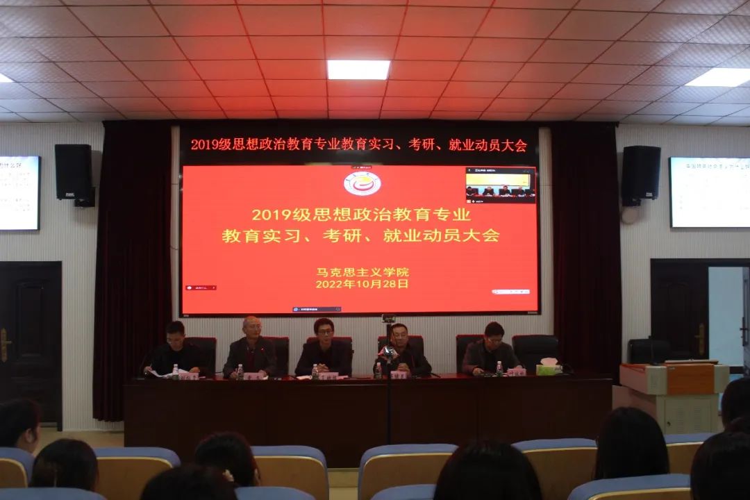 为积极推动2022年教育实习工作全面展开,进一步增强同学们的考研信心,提高毕业生就业意识,2022年10月28日下午14:30william威廉亚洲(中国)有限公司在思政园1207教室召开了2019级思想政治教育专业教育实习、考研、就业动员大会。本次会议由学院副院长曾文主持,学院党委书记柴绪亮、院长肖映胜、党委副书记叶伏秋、教研室主任刘仁贵、教务办老师张岸萍、带队老师杨安然、周红果出席会议,2019级思想政治教育专业全体同学参与会议。