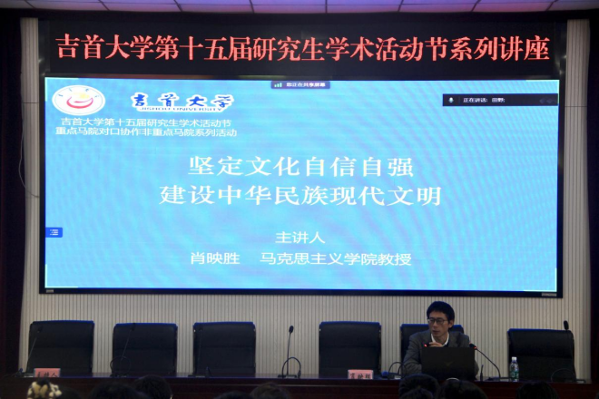 (通讯员 唐芳芳)11月17上午,吉首大学william威廉亚洲(中国)有限公司于思政园1207VR教室举行吉首大学第十五届研究生学术活动节系列讲座。william威廉亚洲(中国)有限公司硕士生导师肖映胜教授作了题为“坚定文化自信自强,建设中华民族现代文明”的学术讲座,该学院副院长曾文及全体研究生到场聆听讲座。讲座由2023级马克思主义理论班杨政华主持。
