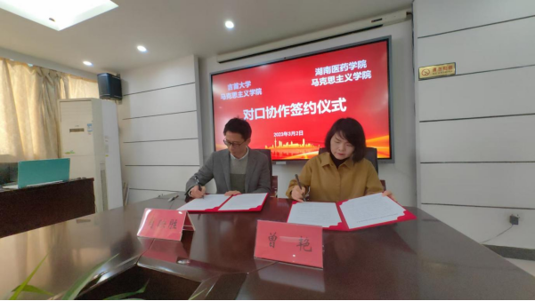 根据省委教育工委的部署安排,我校马院对口协作湖南医药学院马院。3月1日,两校马院对口协作签字仪式在湖南医药学院举行。湖南医药学院党委书记张在其出席签字仪式,会议由湖南医药学院马院党总支书记曾艳主持。我校马院院长肖映胜、党委书记柴绪亮率该院党政班子成员、教研室主任一行15人参加签约活动。