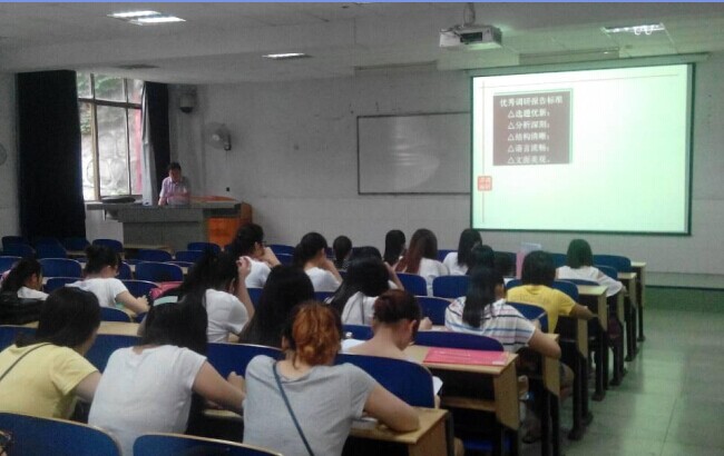 为提高我院学生的社会调查研究能力和水平,6月22日,全体同学在总理楼60116聆听了学院院长廖胜刚教授题为“如何撰写社会调查报告”的讲座。廖老师从调查报告的分类、调查报告的结构、调查报告的特点以及调查报告的要求、如何选题等方面依次展开,其中详细地讲解了调查报告的结构,为同学们作了详细指导,并指出在调查的过程中立场、观点要正确,调查态度要端正,调查目的要明确,要讲究调查方法。