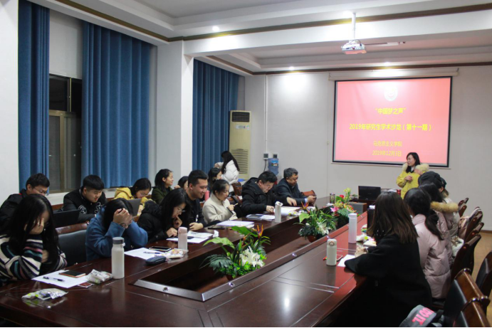 本网讯(文/杨丹)12月3日,我院“中国梦之声”品牌学术活动2019年第十一期研究生学术沙龙举行。18、19级硕士研究生参加此次学术活动,廖胜刚院长、李洪雄书记、孙立青和张欣四位老师莅临指导。本次学术沙龙由19级硕士研究生朱宸忻主持。