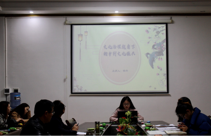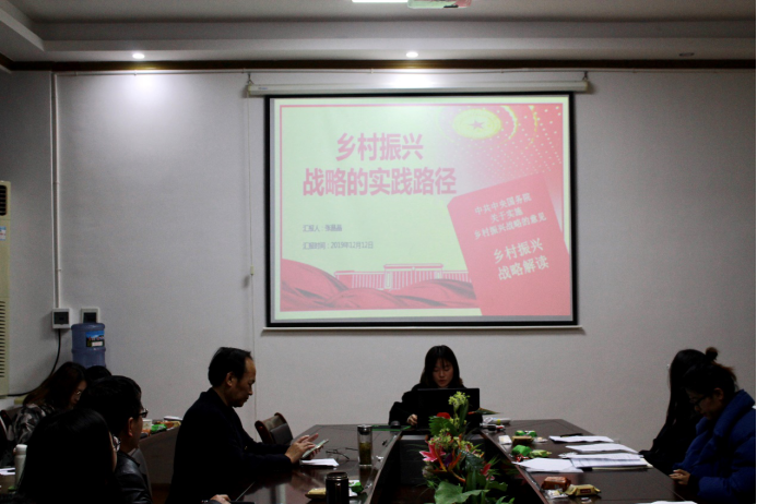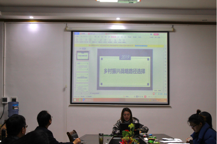 在汇报分享环节,19级四位研究生分别做了观点阐述。其中,杨丹以“文化治理视角下的乡村文化振兴”为题,从文化治理与乡村文化建设、乡村文化振兴与乡村振兴战略目标的多维联合、乡村振兴战略下乡村文化发展体系的建构三个方面,分析了文化治理视角下的乡村文化振兴。杨文卓以“精准脱贫背景下乡村振兴战略的实践路径”为题,首先系统地回顾了历年中央一号文件,然后分析精准脱贫与乡村振兴隅合关系,最后阐述了乡村振兴实践路径。陈黎以“乡村振兴战略路径选择”为题,结合自己家乡的变化,谈了对乡村振兴战略路径选择的理解。张晶晶以“乡村振兴战略的实践路径”为题,介绍乡村人才现状、分析乡村人才“空心化 ”的成因、列举乡村人才振兴的具体措施。