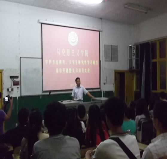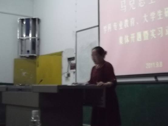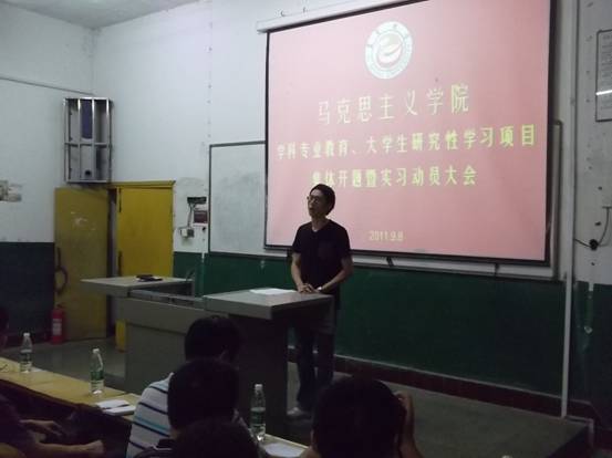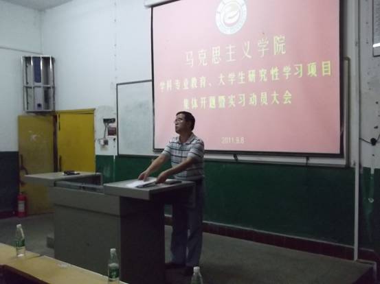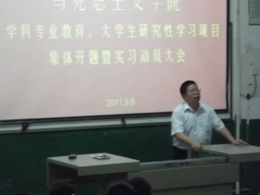 9月8日,在教师节和中秋节即将来临之际,全院的学生实习动员及学生科研开题大会在新1205教室召开。马克思主义院朱廷岚书记,吕学芳院长,廖胜刚副院长等院领导和教授出席会议。08,09,10级思想政治教育班的全体学生参加会议。