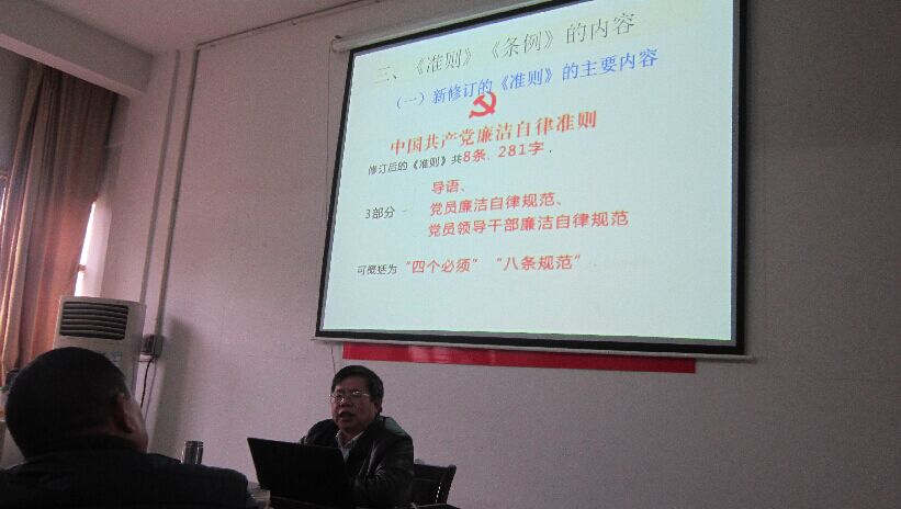 ( 本网讯:吕娟萍)11月10日下午,学院党总支在会议室组织全体教师和学生党员集体学习了中共中央最新修订的《中国共产党廉洁自律准则》(以下简称《准则》)和《中国共产党纪律处分条例》(以上简称《条例》)两部党内法规。