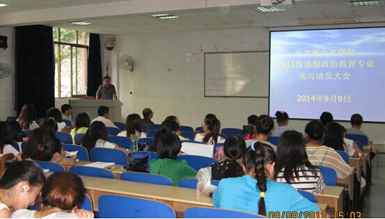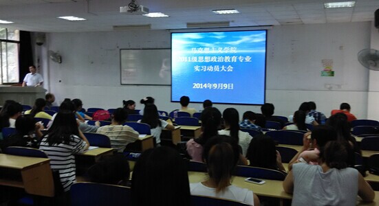 (本网讯 卫红) 根据学校2014年秋季教育实习工作安排以及学院教育实习工作计划,9月9日下午,我院思想政治教育专业2011级教育实习动员大会在60116教室召开。学院院长廖胜刚教授,党总支书记朱廷岚教授,副院长肖映胜教授,院长助理孙忠良副教授,专业教研室主任李乐为教授、副主任刘五景博士,办公室主任吕娟萍老师,学工办罗青梅老师,教育实习带队教师肖时秋老师及2011、2012级学生参加了本次会议。会议由院长廖胜刚教授主持。
