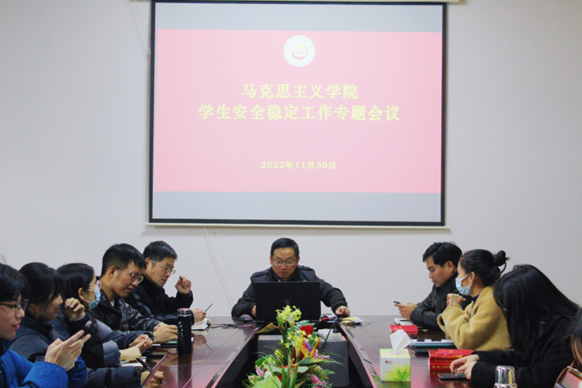 会议传达了学校安全稳定工作会议精神,通报了学校关于调整2022年秋季学期寒假放假时间的通知精神以及疫情防控工作要求,对学院学生放假及疫情防控进行具体的安排部署。柴绪亮围绕政治安全、舆论安全、人身安全三点进行了重点强调。他要求班子成员及行政人员各司其职,落实相关具体工作任务。在学生会议上,他强调指出身为马院学子,一定要明辨是非、理智发声,把握正确的舆论导向,坚持正确的政治方向;他要求同学们合理安排时间,认真准备期末考试,同时注意水电安全,警惕网络诈骗,将自己的人身财产安全摆在首位;他希望马院学子能积极地展现自身风采,学生干部起好带头作用,大家一起发挥马院特色,追求卓越发展。