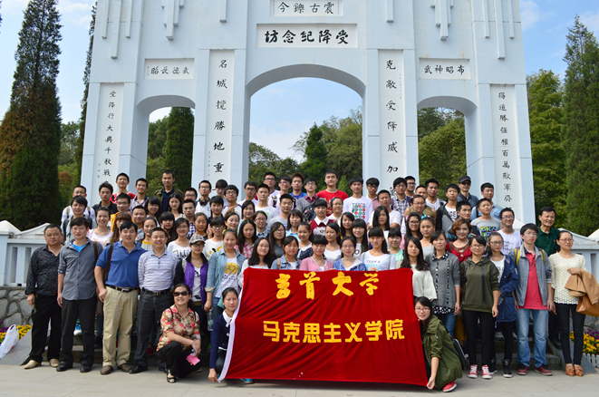 本网讯(孙岚) 2014年9月3日是中国人民抗日战争和世界反法西斯战争胜利69周年纪念日,也是全国人大常委会以立法形式确立中国人民抗日战争胜利纪念日后的首个纪念日。为了缅怀革命先烈,铭记抗战历史,弘扬抗战精神,激励当代大学生为实现中华民族伟大复兴的中国梦而努力奋斗,根据《近现代史纲要》、《毛泽东思想和中国特色社会主义理论体系概论》的实践教学计划,10月25日马克思主义中国化教研室组织全校2013级、2014级学生代表80余人于赴怀化芷江受降纪念馆开展了以爱国主义教育为主题的社会实践教学活动。