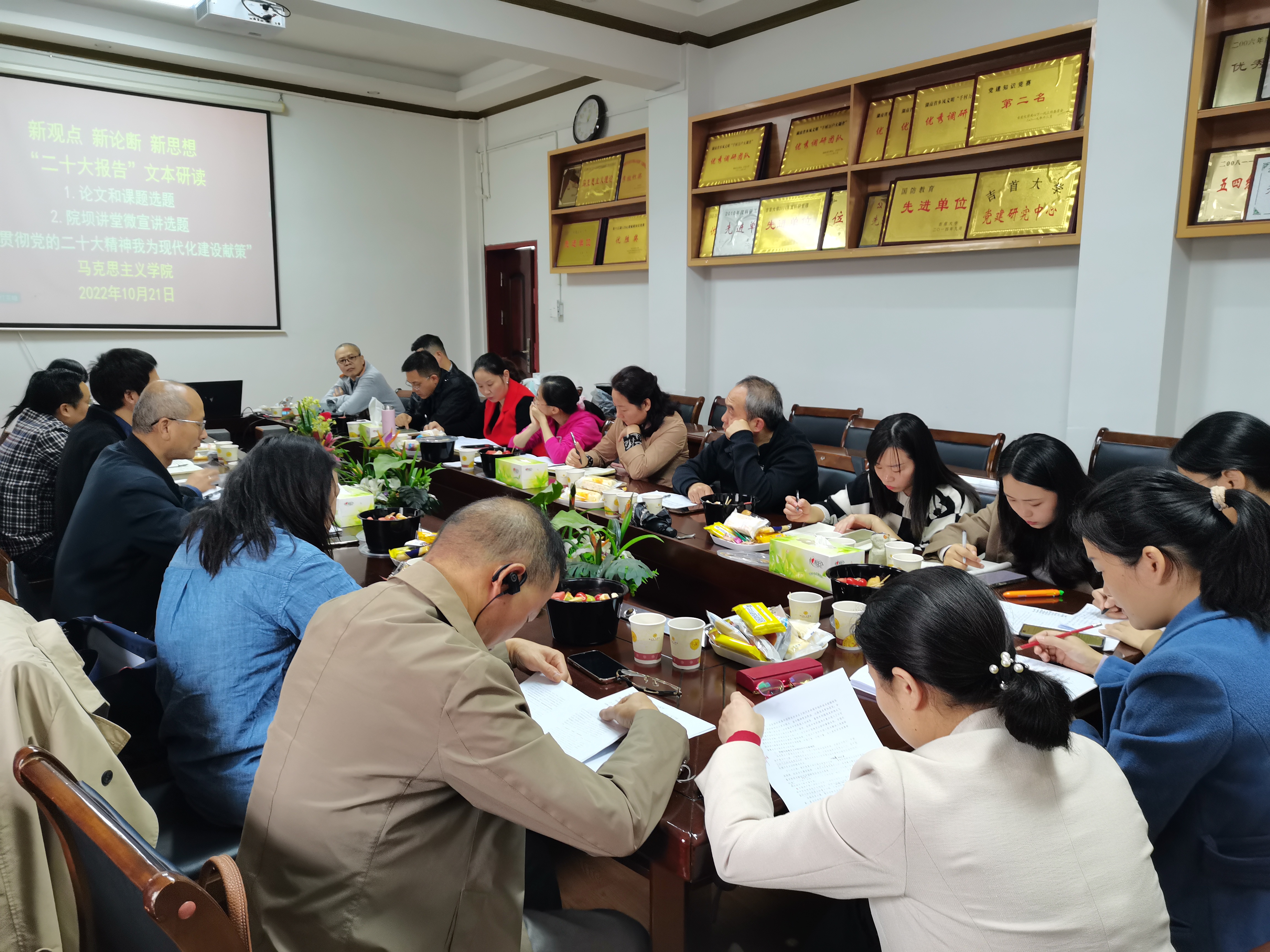 10月21日上午,学院组织开展以“新观点 新论断 新思想”为主题的党的二十大报告文本的研读活动。院长肖映胜主持学习研读活动,院党委书记柴绪亮、副院长曾文及吉首校区的博士、新进教师代表参加会议。