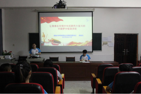 柴绪亮以青年要在中华民族伟大复兴中绽放异彩为题,用喜闻乐见的方式向同学们讲解了如何在百年党史中汲取智慧与力量,他通过列举历史人物事件和联系自身经历告诉同学们要始终站在时代前列,争当复兴民族大任的时代新人;要坚定对家乡发展的信心与信念,努力为家乡做贡献。最后,他以习近平总书记对青年的一段寄语结束,鼓舞大家要艰苦奋斗、砥砺前行。