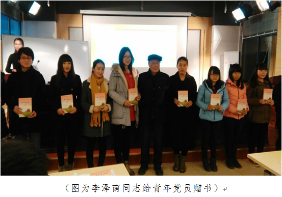 本网讯(通讯员 朱夕夜)为发挥五老(老干部、老战士、老专家、老教师、老模范)的作用,进一步加强新老党员同志之间的交流,12月15日,我院党总支在新校区实验大楼举行了李泽南教师为我院学生党员和入党积极分子赠书仪式。院党总支书记朱廷岚教授、学生党支部书记罗青梅老师出席了赠书仪式。张黎萱担任主持人。