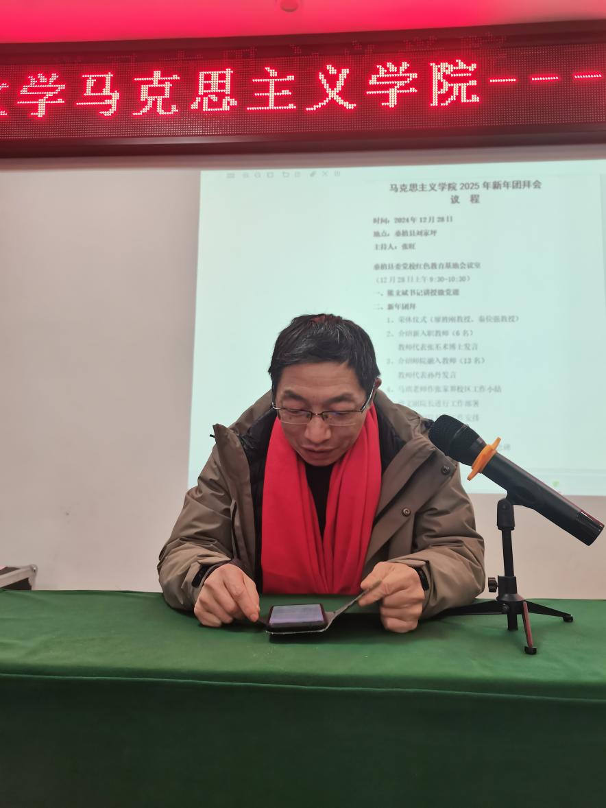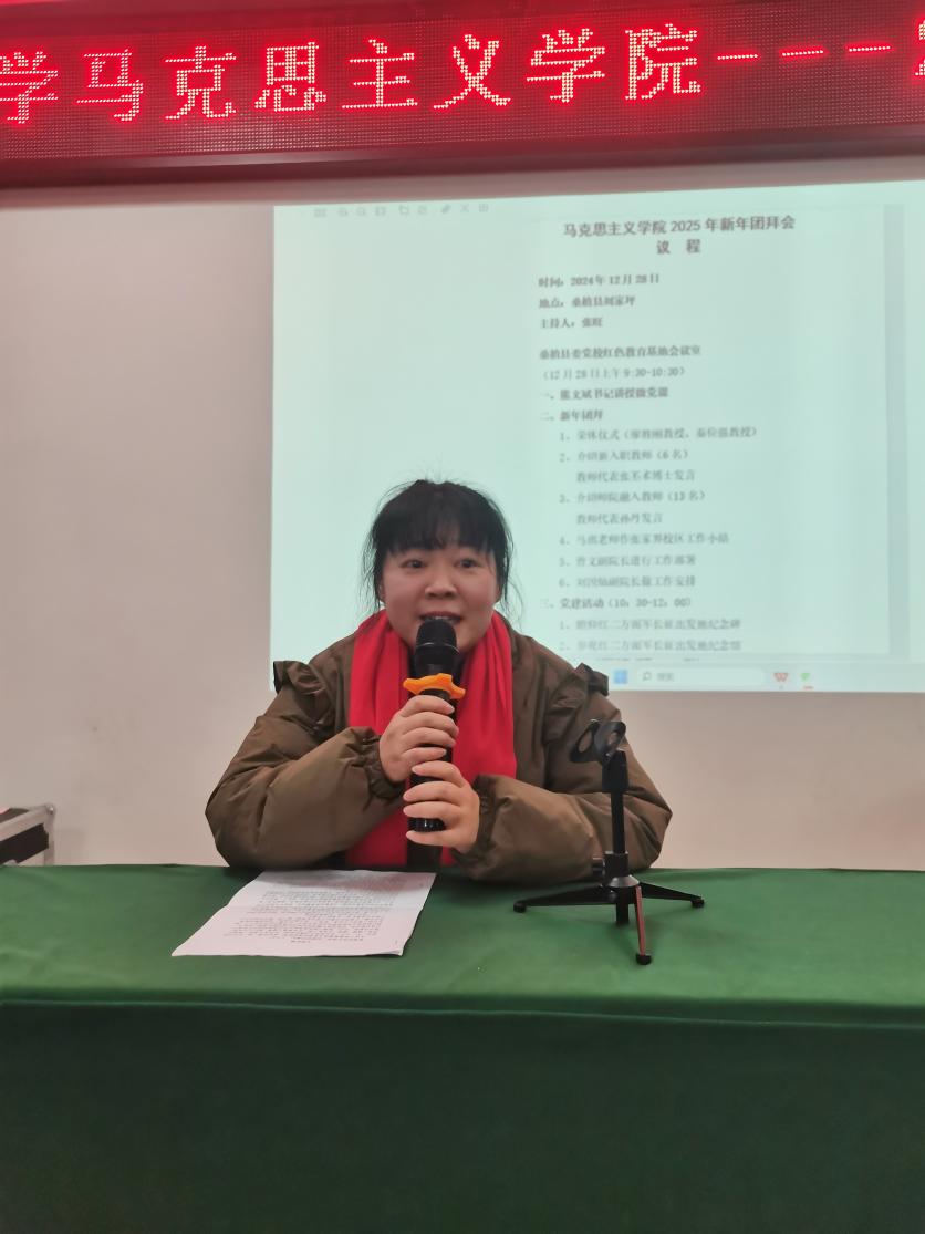 团拜会的“重头戏”是6名新进教师以及原师范学院新融入的13名教师进行自我介绍,张丕术博士作为新进教师代表,孙丹老师作为新融入教师代表进行了发言。大家在自我介绍和发言中纷纷表示,在新的一年里,要发扬“艰苦奋斗、勇于创新”的马院精神,为学院的繁荣发展贡献自己的力量。
