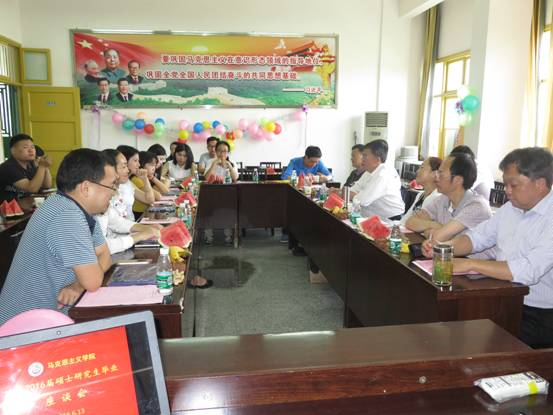 廖院长说,举行隆重的毕业座谈会,就是举行毕业典礼,是让我们一起见证大家迈向光辉未来的开始!这是一个充满喜悦和希望的时刻。廖院长肯定,马克思主义理论学科2016届学生是一个有理想、有道德、有纪律、学业好的优秀集体。发展为党员及预备党员多人,获得一等奖学金、三好学生、优秀干部、课题及德育项目、发表论文、全国民族高校研究生论坛奖、吉首大学研究生论坛奖、英语演讲比赛特等奖、优秀毕业生、优秀毕业论文多人次。