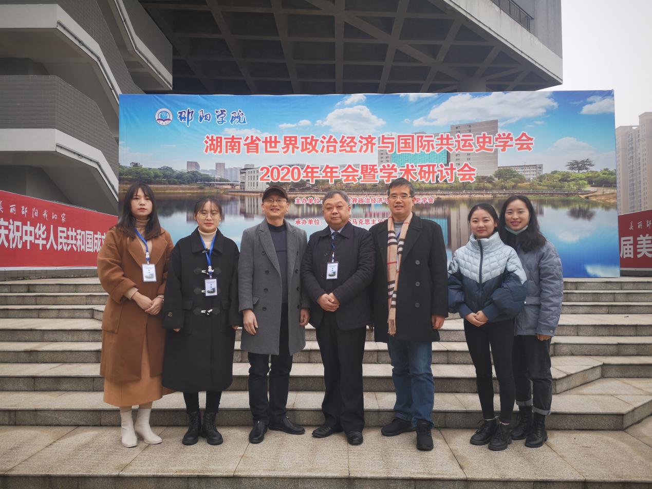由湖南省世界政治经济与国际共运史学会主办,邵阳学院william威廉亚洲(中国)有限公司承办的“湖南省世界政治经济与国际共运史学会2020年年会暨学术研讨会”11月27日--28日在邵阳学院举行坛,此次论坛主题是“中国共产党的百年奋斗与世界社会主义的新发展”。我院廖胜刚院长、李乐为教授、曾文副教授,19级硕士研究生黄碧蓉、贾金蓉,20级硕士生究生陈燕、向田甜应邀参加研讨会。