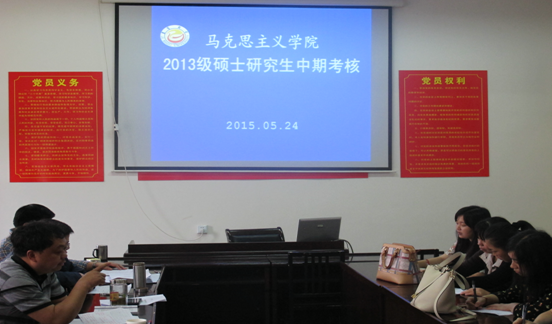 本网讯(文/薛菁)根据研究生处《关于2015年研究生中期考核工作安排的通知》精神,对研究生掌握本学科基本知识以及科研能力进行评价,以考察其是否具备进入下一阶段学习的能力,5月24日上午8点30分,我院马克思主义理论学科2013级硕士研究生中期考核工作在学院会议室进行。考核工作由廖胜刚院长主持,硕士生导师朱廷岚、彭兴富、刘兴章、李乐为、郑流云以及2013级硕士研究生王永霞、宁笑菲、张元元、张紫艳、陈微湘、任燎原、龚璇、童春香、向爽、樊涛、黄思思、彭帅、岑庆知、薛菁、蒋一娴、梁诚嘉、冯蕾出席。