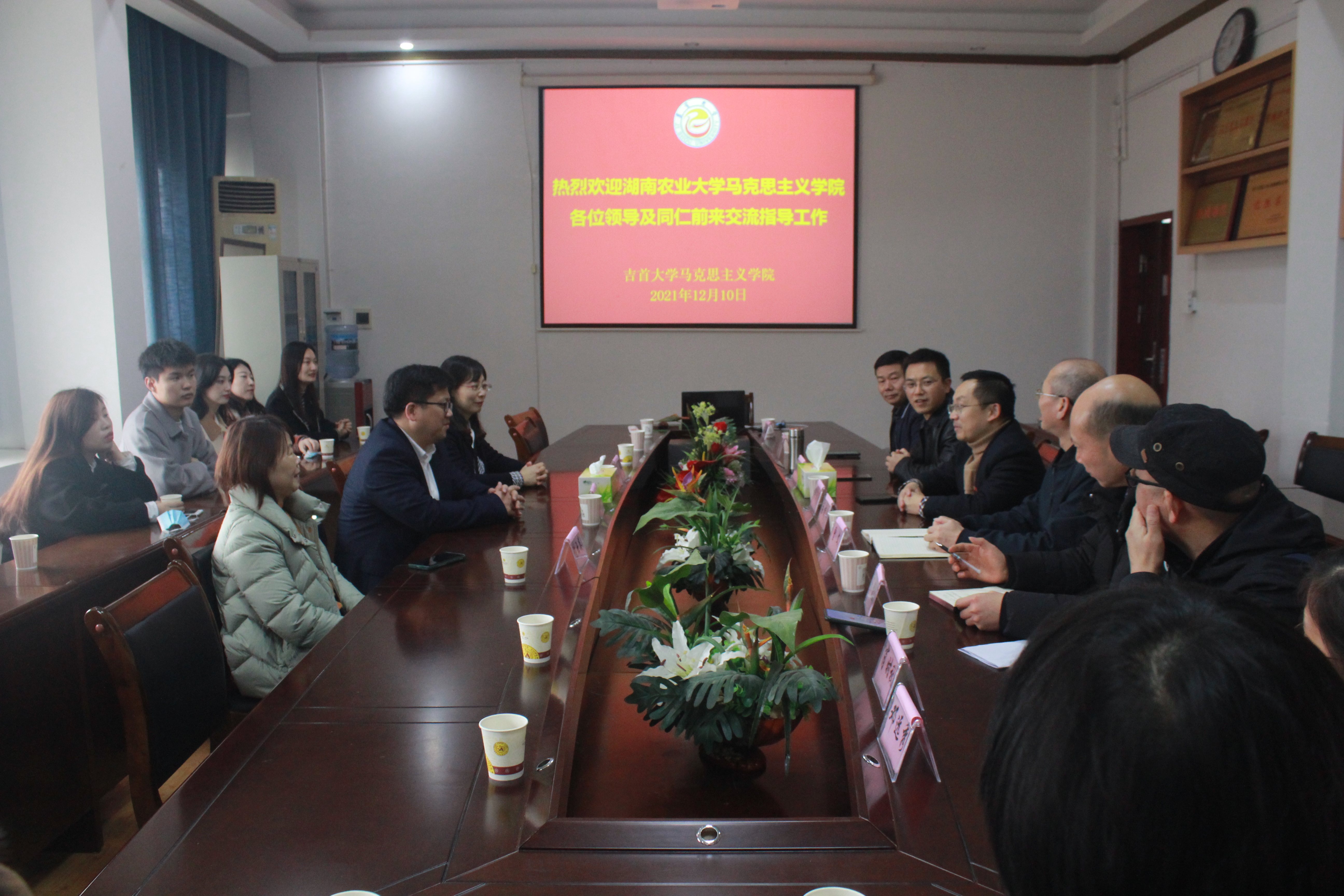 交流会上,大家集体观看了吉首大学宣传片《使命》。柴绪亮书记致欢迎词并介绍了学院的整体情况,胡艺华院长介绍了农大思政课教学的改革创新工作。双方还就教学、科研、管理等方面进行了广泛交流,表示两院要加强合作与交流,深入地探讨思政课教学改革。