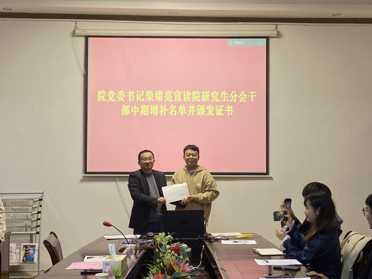 最后,柴绪亮针对本次会议谈了三点看法。一是研会干部应该如何看待过去的工作?怎么做好未来一年乃至更长远的工作?他提醒干部们要注意工作的方式方法;工作要采取评估机制;格局要放大,眼界要更广。二是要过有意义的研究生生活。他希望干部们能胸怀大志,充满精气神,以及在工作和学习中实现实干、苦干、巧干。三是怎么锻造丰富的人生内涵?他总结为四个要点:讲政治、守规矩、有情怀、讲感情。这样才能让干部们顺利开展学院工作的同时也能不断提升自身的综合素质。他也对干部们寄予厚望,希望大家团结一致继续向前,能让研究生工作再上一个崭新的台阶。