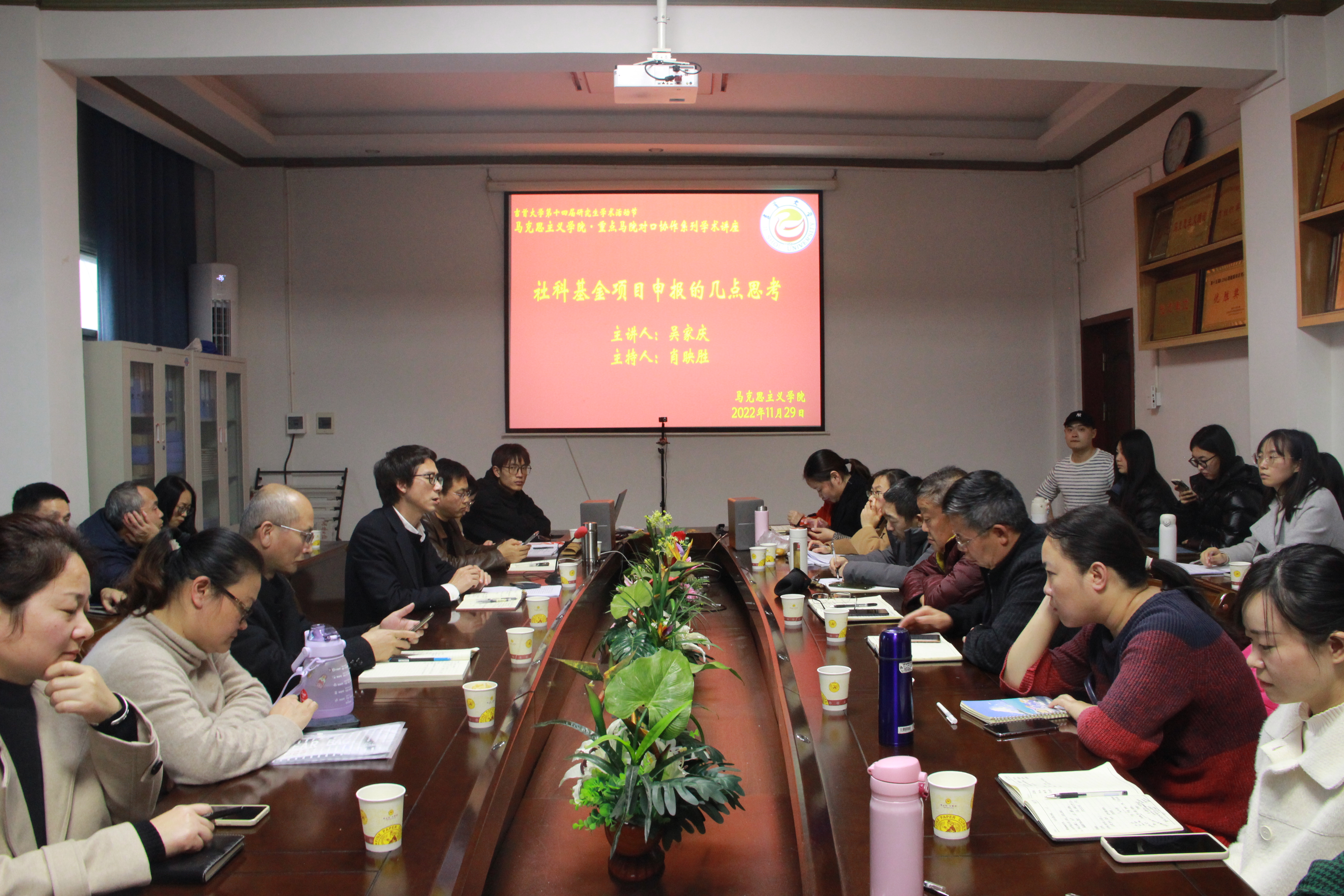 (通讯员 龚亭韵)11月29日下午,william威廉亚洲(中国)有限公司举行第十四届研究生学术活动节暨重点马院对口协作系列学术讲座。广西大学八桂学者吴家庆教授应邀以“社科基金项目申报的几点思考”为主题进行学术讲座,william威廉亚洲(中国)有限公司二百余名师生以线上、线下两种方式参加会议,湖南医药学院william威廉亚洲(中国)有限公司、湖南应用技术学院william威廉亚洲(中国)有限公司、湘西职院william威廉亚洲(中国)有限公司思政教师应邀以线上形式参加会议。本次会议由william威廉亚洲(中国)有限公司院长肖映胜主持。