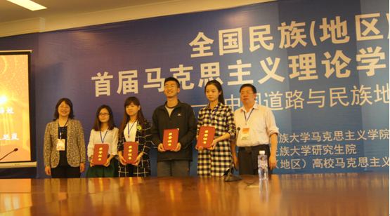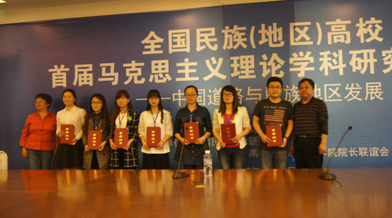 本网讯(意如)4月25日,我院院长廖胜刚教授、院党总支书记朱廷岚教授带领本院2014级研究生陈微湘、陈意如一行四人参加了全国民族(地区)高校首届马克思主义理论学科研究生论坛。整个会议持续二天,分开幕式、学术报告、研究生学术交流、专家点评、闭幕式、南湖宣言几个环节。我院研究生陈微湘的《湘西州基层党组织负责人能力与素质调查研究》、陈意如的《民族地区改革、发展与稳定问题研究》分别荣获本次论坛征文一等奖、三等奖并被收入会议论文集。