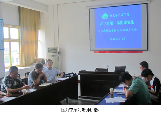 廖胜刚院长首先回顾总结了2015年研究生招生复试、2014级研究生专业课程的学习、研究生德育实践项目和科研项目立项、参加学术会议、2013级研究生中期考核、2015届研究生毕业论文答辩、研究生评优评奖荣获各项荣誉以及学科建设方面修订了马克思主义理论学科人培养方案、制定了马克思主义理论学科“十三五”规划等工作。廖院长对本学期辛勤工作的导师们表示由衷感谢并致以崇高敬意。他说,质量是研究生教育的生命线,国家建立研究生质量信息平台等举措对研究生教育质量提出了更高更明确的要求,要更加重视构建符合教育规律、适应发展需要、具有马克思主义理论学科特色质量监督保证体系。廖院长说,当前学院研究生教育教学工作突出应用型人才培养,以应用型人才培养目标为主线,从学科的办学定位、指导思想等顶层设计,到师资队伍建设、教学基本建设、学科专业建设、人才培养方案、实践教学体系和质量保障体系建设,一以贯之地推进内涵式发展道路。对照学位办合格评估指标要求,我们深刻地认识到,研究生教育教学工作距离学校“先进”要求还存在着一定的差距。主要体现在:师资队伍数量不足,学科专业之间不平衡,缺乏高水平带头人;学科优势和专业特色不突出;科研意识强但科研水平不高,产学研对应用型人才培养的支撑力度不够;学术风气不够浓厚,教风引领学风、学风促进校风的良性机制没有完全形成,研究生主动学习意识不强、动力不足、目标不明。学院将进一步加强研究生高层次人才培养工作,开拓创新,着力解决研究生教育管理工作中存在的问题。