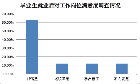 有效抽样调查的毕业生28人中,对目前工作“很满意”的17人占61%,“比较满意”的 4人占14%,“凑合着干”的 4人,占14%,“不太满意,还想调换”的3人占11%。见表图六:
