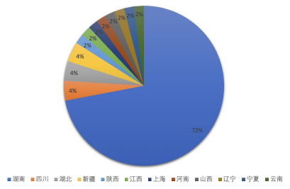 我院2022届毕业生78%的同学回生源地就业,其中在湖南就业的同学占已就业毕业生总数的72%,四川、湖北、新疆、陕西、江西、上海、河南、山西、辽宁、宁夏、云南等地分别占4%、4%、4%、2%、2%、2%、2%、2%、2%、2%、2%。见表图四: